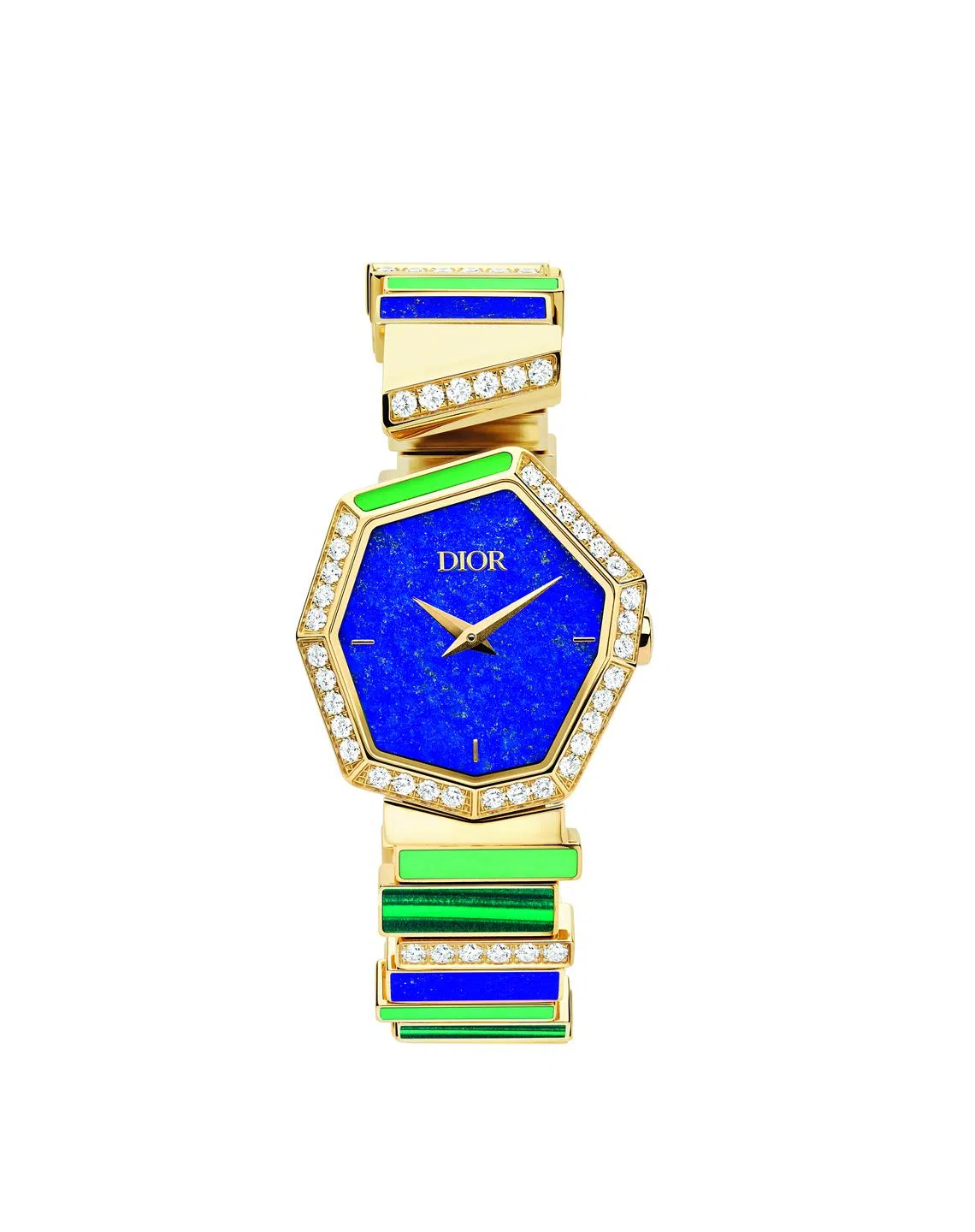 At Dior, a balance between refinement and simplicity is seen in its Gem Dior collection. Timepieces here play on graphic lines and organic abstraction arising from both a love of stones and of couture. Inspired by the colourful fabric swatches of Christian Dior’s couture collections, asymmetrically composed pieces of stones fit together like mineral strata. In one model, for instance, yellow gold is set with chrysoprase, lapis lazuli, malachite and diamonds.