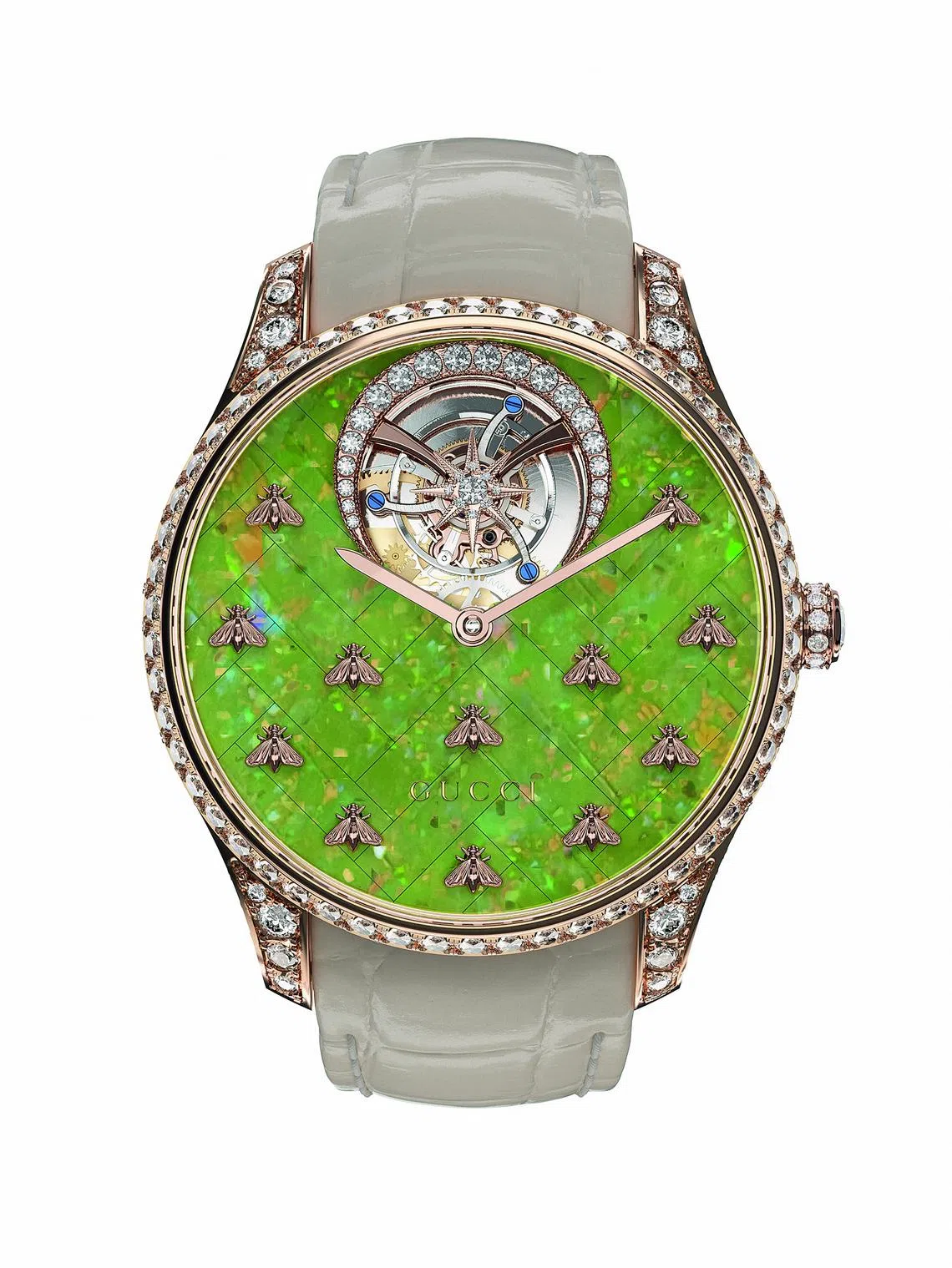 For something elegant yet slightly quirky, go for Gucci’s G-Timeless Dancing Bees, which celebrates, well, bees. In a pink gold case set with diamonds sits a vibrant green opal dial and 12 moving golden bees which flutter and shimmer with the slightest movement of the wrist. A star-studded tourbillon within a diamond-set crescent at 12 o’clock and an alligator strap complete this beautiful timepiece.