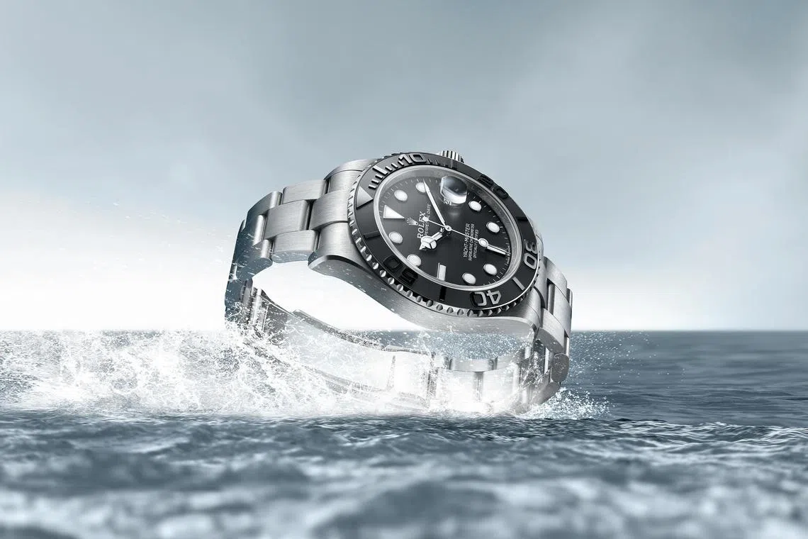 This is Rolex’s second watch in RLX titanium, after the Deepsea Challenge rolled out last November. Both its 42mm case and bracelet are made of RLX titanium, so the new Yacht-Master 42, unlike past models, is feather-light yet strong and highly protected from corrosion. Just what navigators and skippers want. Indeed, the model, launched in 1992, was designed for them from the start. It has a bidirectional rotatable 60-minute graduated bezel fitted with a Cerachrom insert in matt black ceramic. This is very useful for sailing and in identifying the Yacht-Master 42. The new version stands out for its technical satin finish – a satin finish with a visible grain, a feature of Rolex watches in RLX titanium – which extends to the middle case sides, the edges of the bracelet links and the sides of the clasp cover. Price: S$19,600