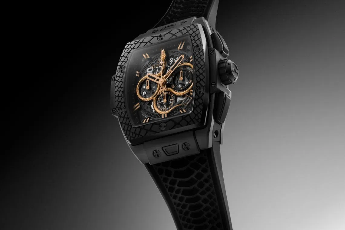 The barrel-shaped ceramic case is a perfect canvas for Hublot’s craftsmanship, featuring a bezel engraved with intricate snake scales. This pattern flows seamlessly into the black rubber strap, which boasts a unique velvet-like shimmer achieved through innovative embossing.