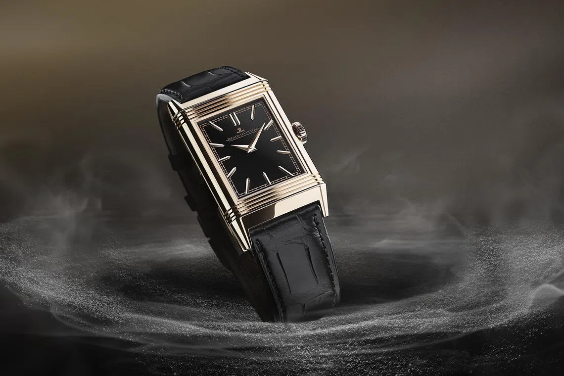 True to the Art Deco aesthetic of the Reverso Tribute, the dial features faceted hour-markers, a chemin de fer minutes track, and Dauphine hands. All this is set against the striking black enamel dial, which looks deceptively plain but belies the complex and unpredictable nature of Grand Feu enamelling.