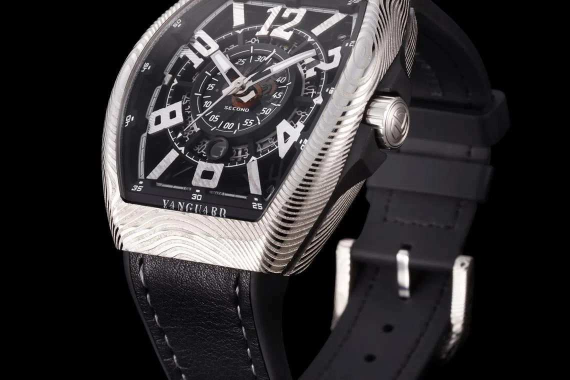 There’s also a Vanguard Damas Racing (S$35,000) version of the model, distinguished by its combination of the Damascus steel’s edginess and the Vanguard Racing Skeleton’s sportiness. Its dial is skeletonised to a refined depth, revealing the elaborate architecture and inner workings of the watch.