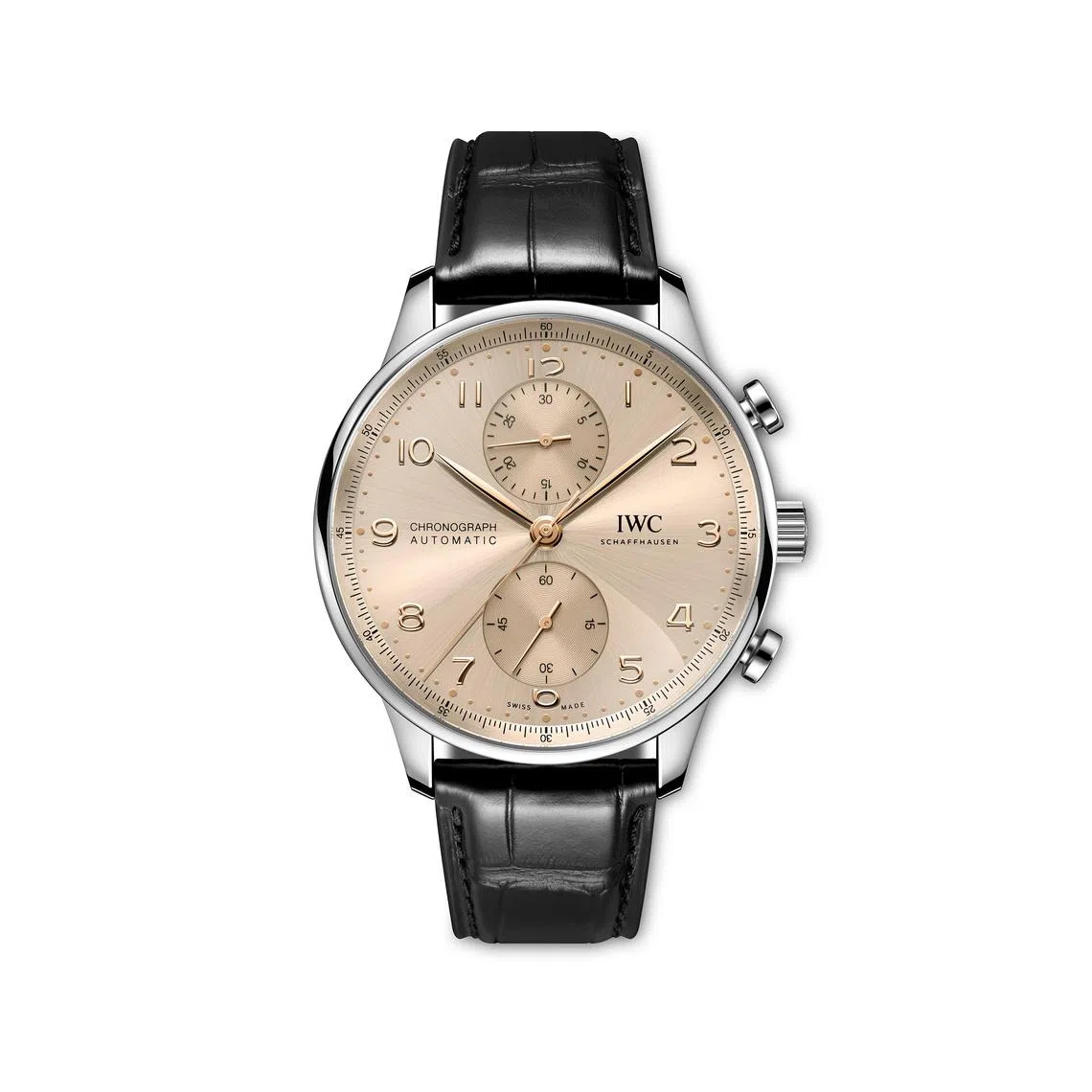 Running on an automatic movement with 46 hours’ power reserve, the Portugieser Chronograph has several versions: one with a Horizon Blue dial encased in 18-ct white gold and a matching gradient light-blue calfskin strap; another with an Obsidian black dial, an 18-ct 5N gold case and black alligator leather strap; and still another with a Dune dial, a stainless steel case and a black alligator strap.