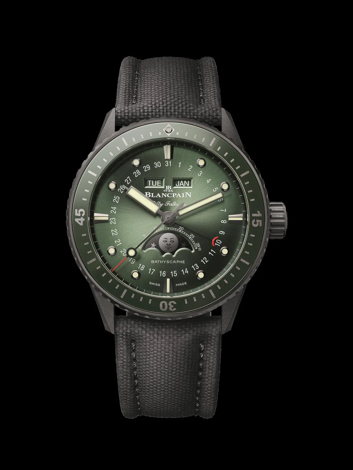 Blancpain debuts the Bathyscaphe Quantieme Complet Phases de Lune, which combines the manufacture’s legendary dive-watch heritage with a surprising twist of high elegance – an all-new high-tech ceramic bracelet
