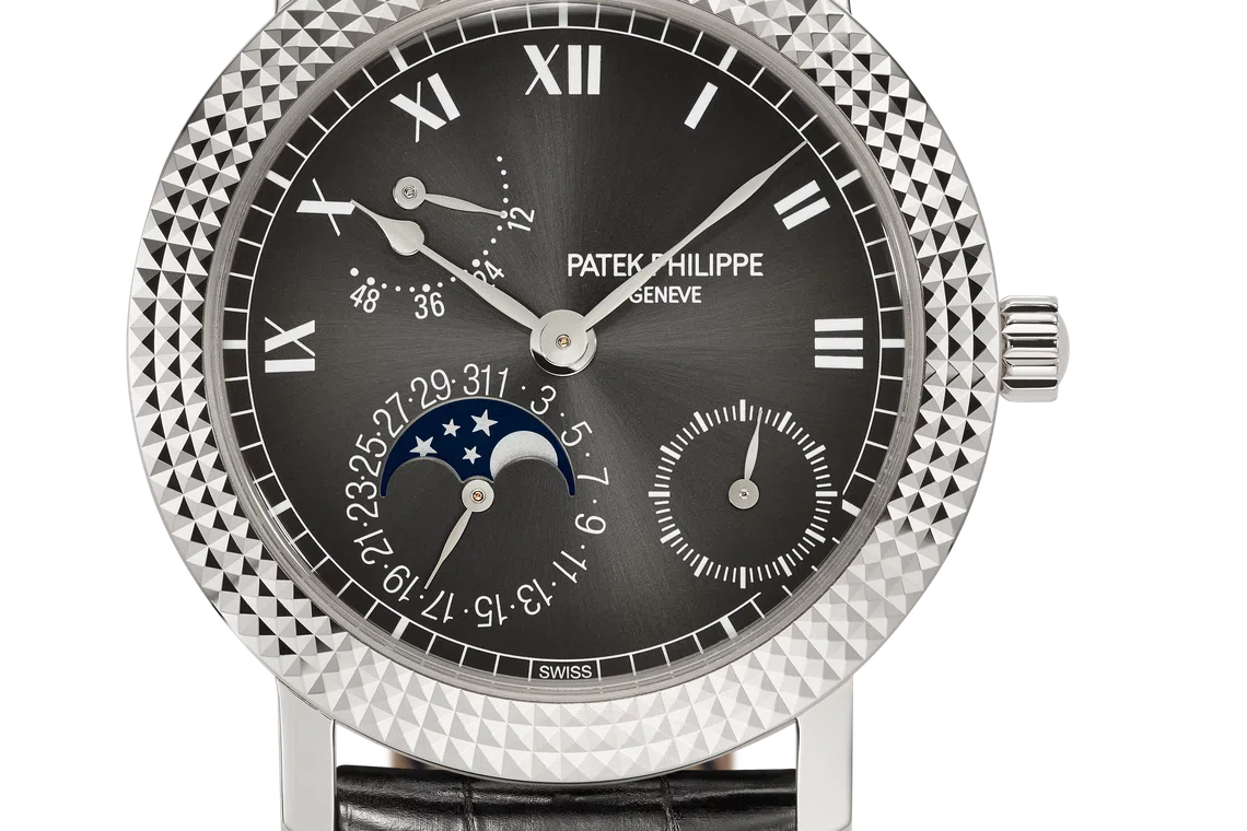 The white gold Calatrava, like its predecessor, features the triple row guilloched “Clous de Paris” hobnail bezel but it has also been updated with a charcoal grey sunburst dial with a black-gradient rim, white transfer-printed Roman numerals and white gold, pear-shaped hands.