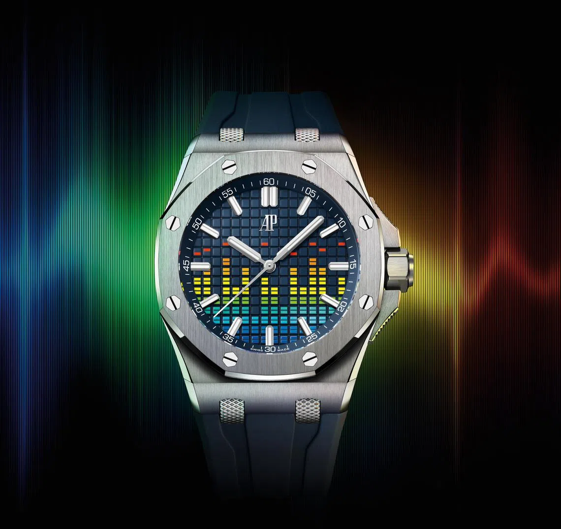 This could be mistaken as the Audemars Piguet-Carolina Bucci Royal Oak Offshore 50th Anniversary watch Part II. Its multi-coloured dial is similar to the rainbow dial of the earlier timepiece, rolled out just a month ago. But music aficionados will be quick to recognise that the columns of colours on the new watch bear the pattern of equaliser (or VU meter), used in recording studios.