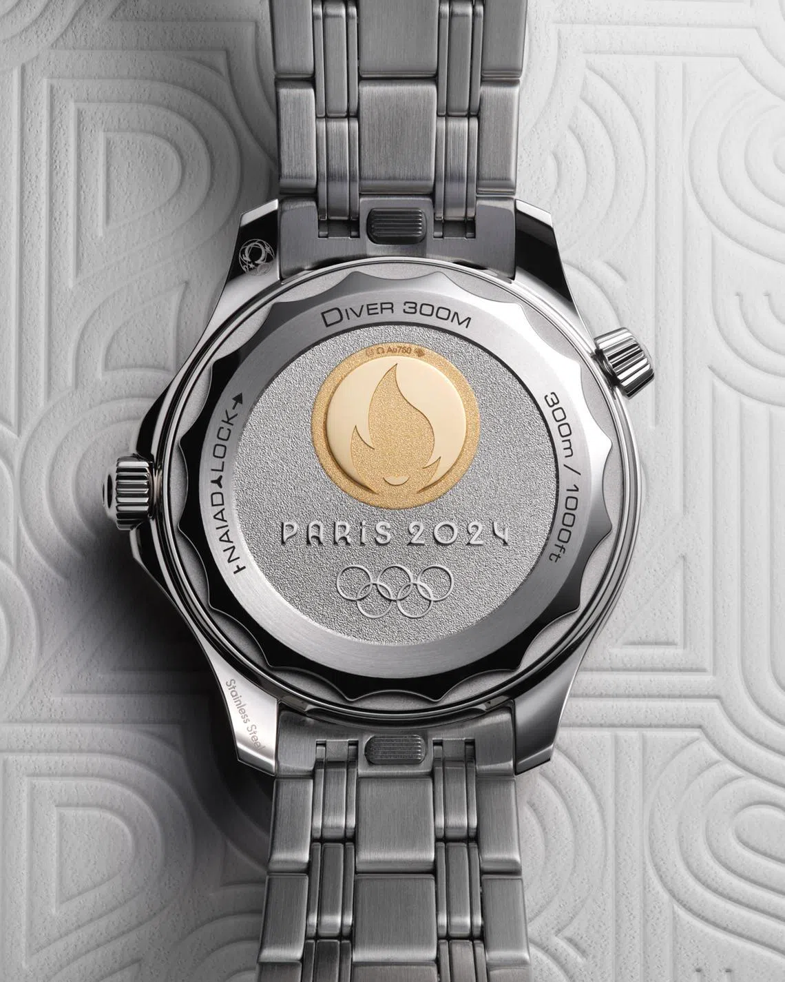 For those who prefer a sportier look, the Seamaster Diver 300M Paris 2024 special edition comes in a 42 mm stainless steel case, with an 18k Moonshine Gold bezel and a white ceramic dial. The dial itself is a work of art, with polished waves in positive relief set against a matte finish. Olympic touches abound, including a Paris 2024 emblem on the central second hand and the use of Paris 2024 typography on the date wheel.