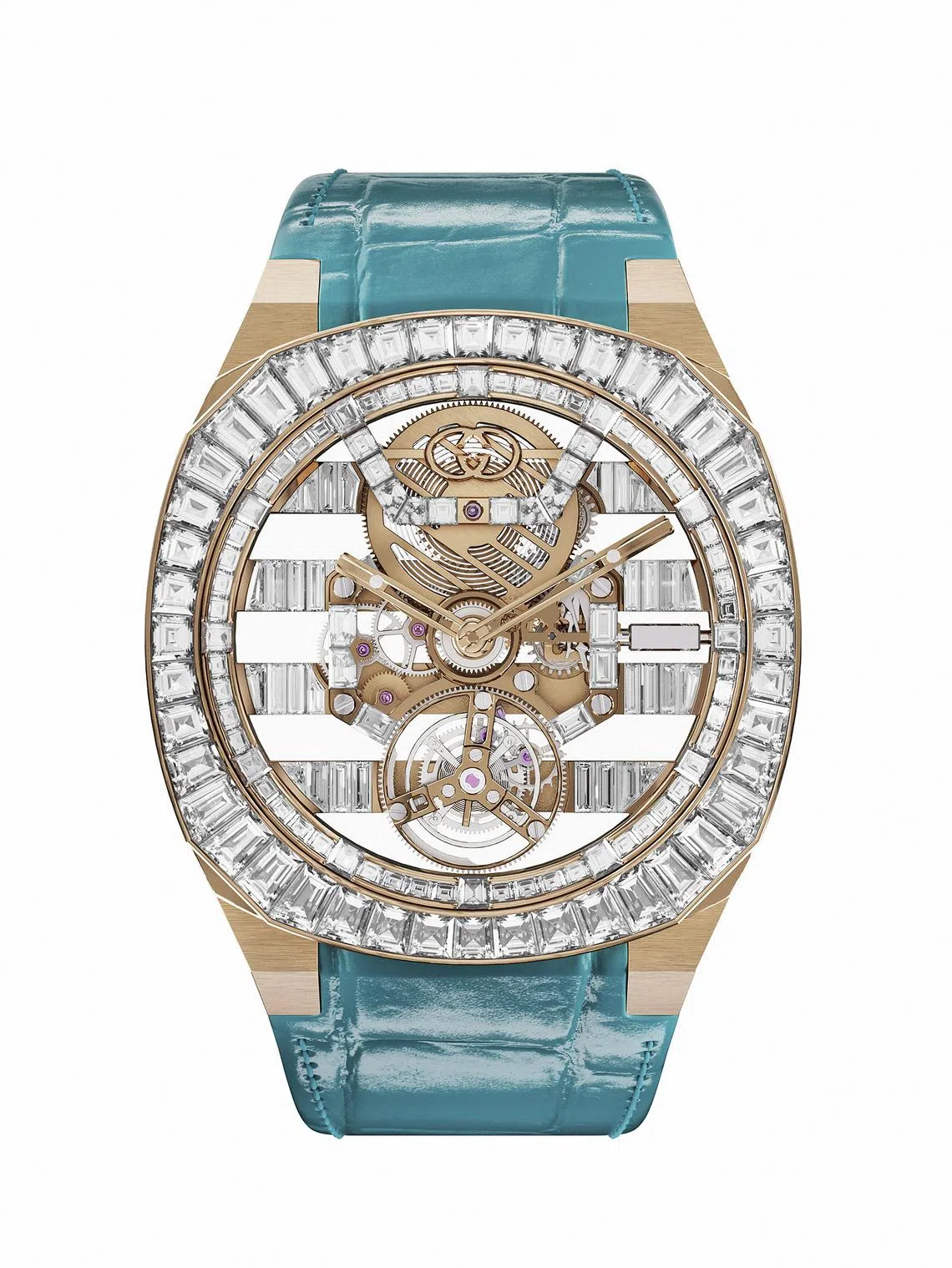 The Gucci 25H, although a tad more serious, is no less exuberant. It features two skeletonised tourbillon models: one whimsically modern with coloured bridges, and the other, loud and extravagant, set with diamonds on the floating bridges and the bezel.