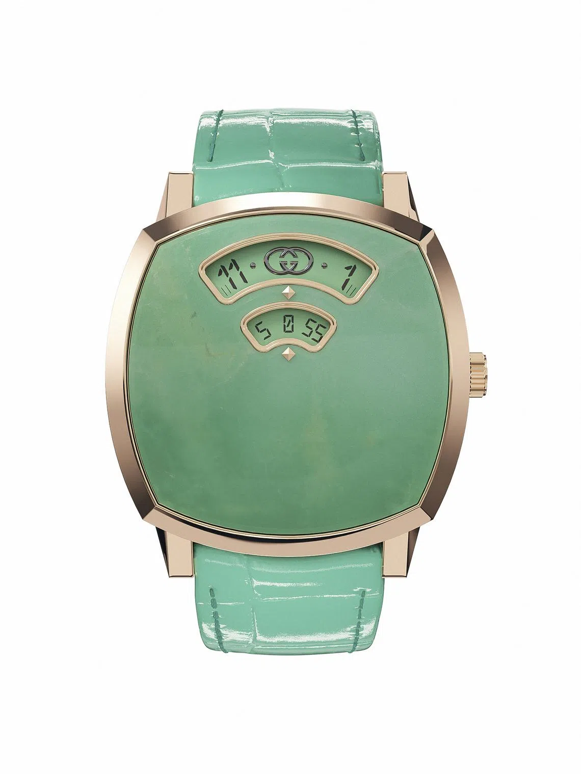 Gucci also seeks to articulate its horological perspectives through design. The retro-inspired Grip collection, launched in 2019, continues to command attention with its jumping-hour display. The wonderfully minimalist dial features two gold-framed windows, one to show the hour and, the other, the minutes in five-minute increments. Based on a mechanism invented in the 1920s, the jumping-hour disc switches instantaneously at the end of every 59-minute cycle.
