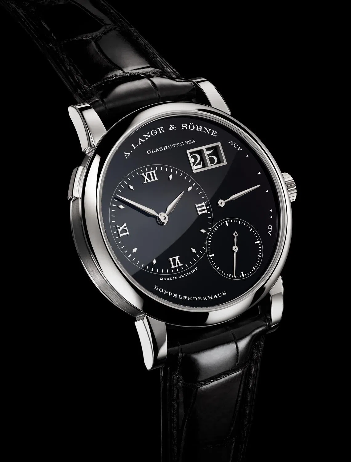 The first is a platinum model with a black onyx dial – a rare material in watchmaking that elevates the timepiece to a new level of sophistication. Incidentally, this is the first time that the gemstone has been incorporated into the Lange 1, and it is a choice that pays off brilliantly.