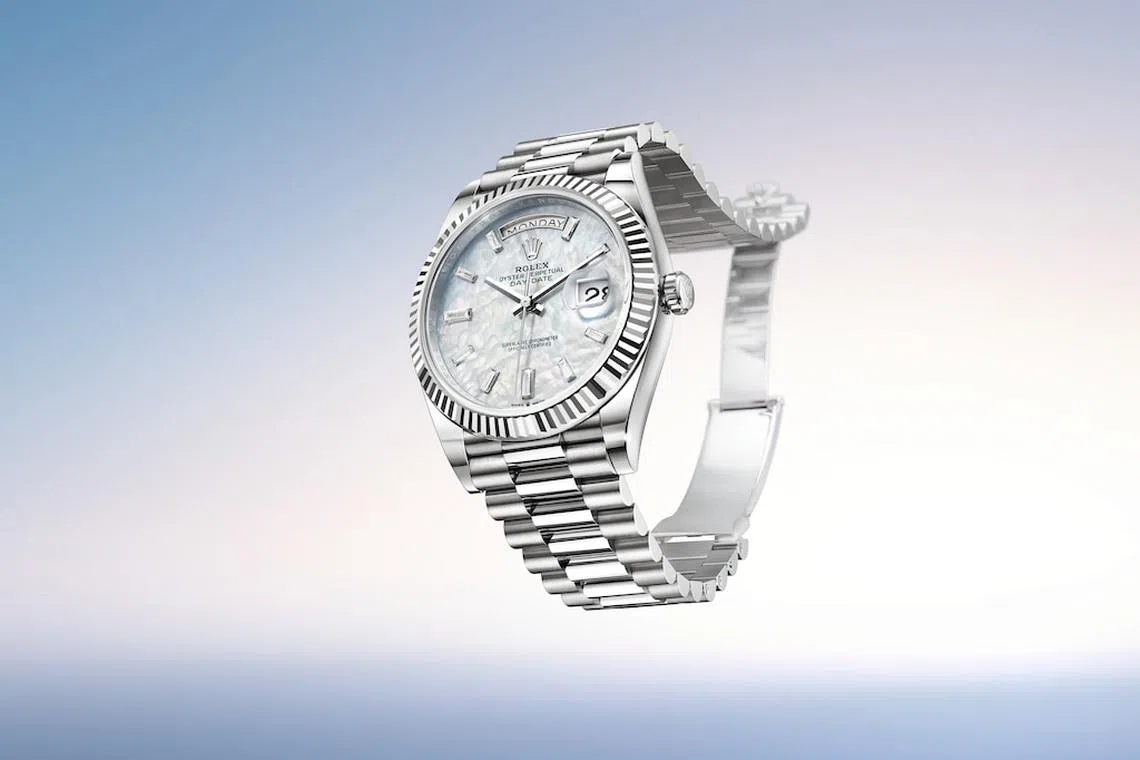 The second version, in 18 ct white gold, introduces a pearlised white mother-of-pearl dial: a first for the Day-Date 40. This exquisite dial shimmers with iridescent reflections, enhanced by 10 baguette-cut diamond hour markers.