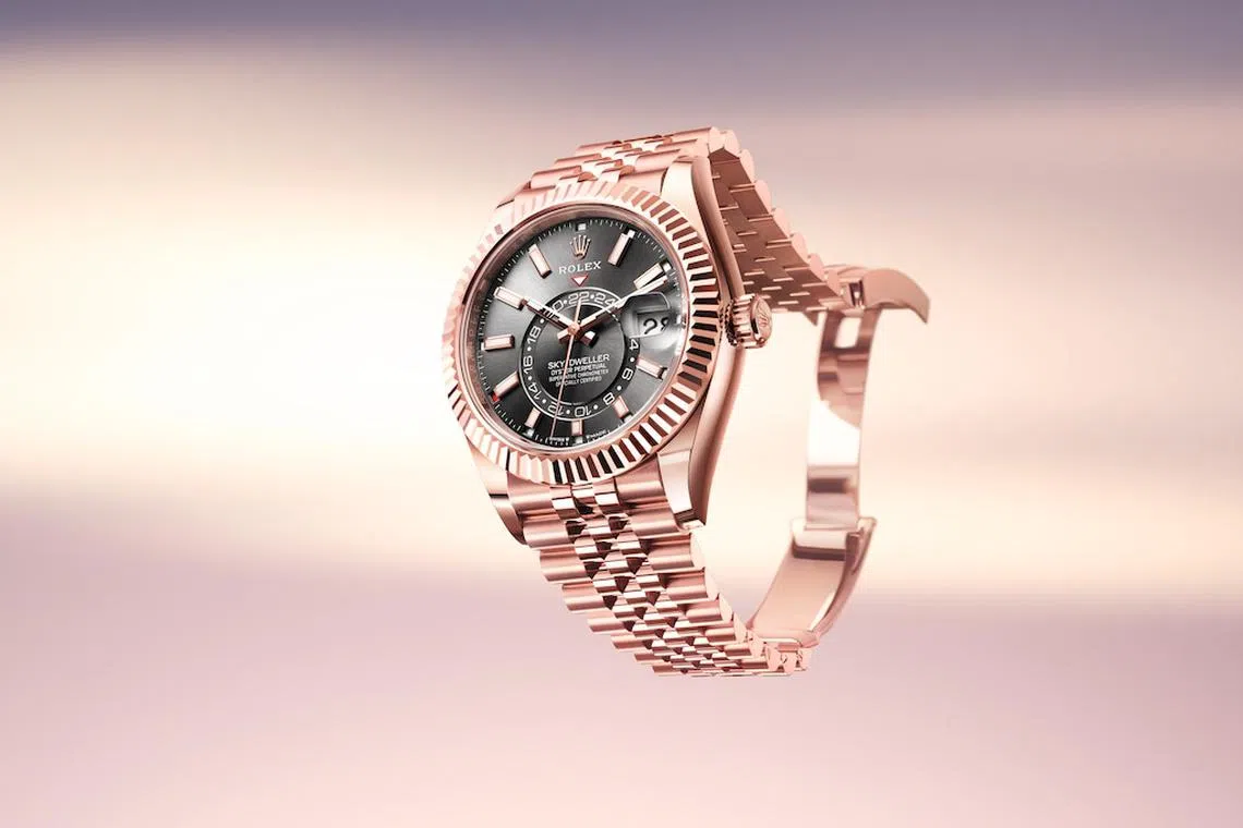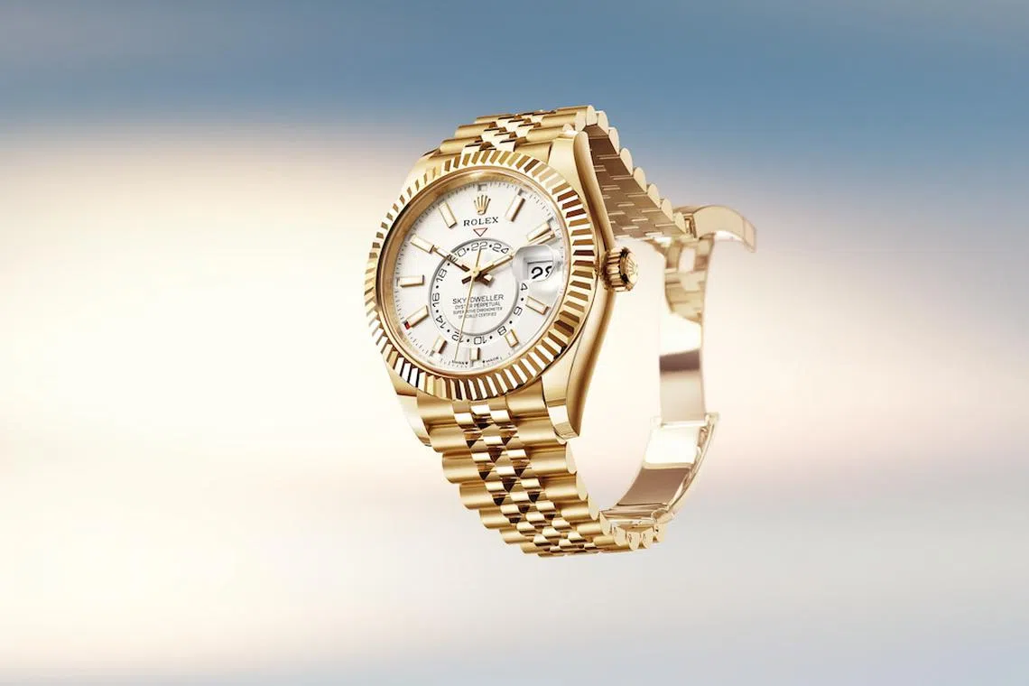 The Oyster Perpetual Sky-Dweller now offers enhanced elegance with the introduction of a Jubilee bracelet in 18 ct Everose or yellow gold. This sophisticated timepiece allows travellers to effortlessly adjust their time zones while enjoying the harmonious interplay of polished and satin-finished links.