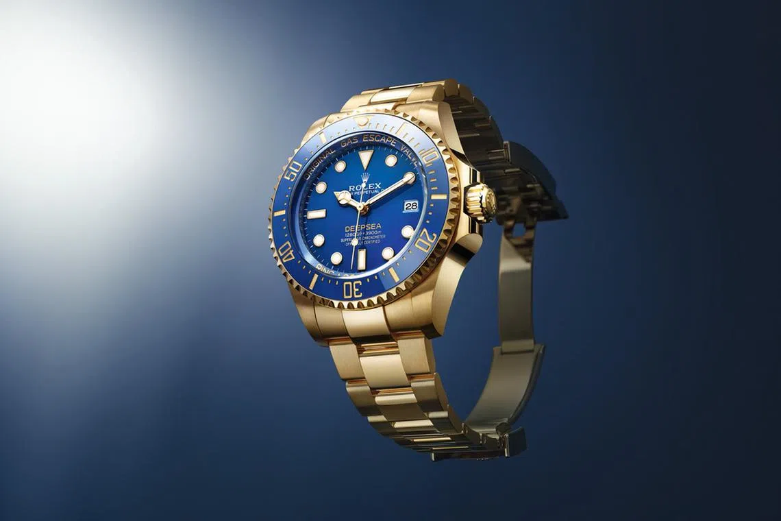 The Oyster Perpetual Rolex Deepsea has been reimagined with an unprecedented combination of materials – 18 ct yellow gold paired with ceramic and RLX titanium – creating a timepiece that is both majestic and functional. The blue compression ring made from ceramic is integrated into the Ringlock system, allowing it to withstand extreme underwater pressures. This watch is designed not just to survive the depths but to shine brightly within them.