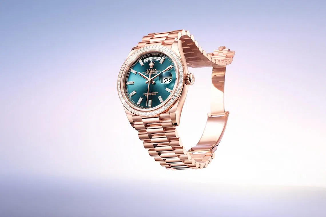 The Day-Date 36 model sees similar innovations with two new releases: one in 18 ct yellow gold featuring a white lacquer dial with faceted Roman numerals, and another in 18 ct Everose gold showcasing a striking blue-green dial framed by 60 trapeze-cut diamonds on the bezel – a first for an 18 ct gold version of the watch.