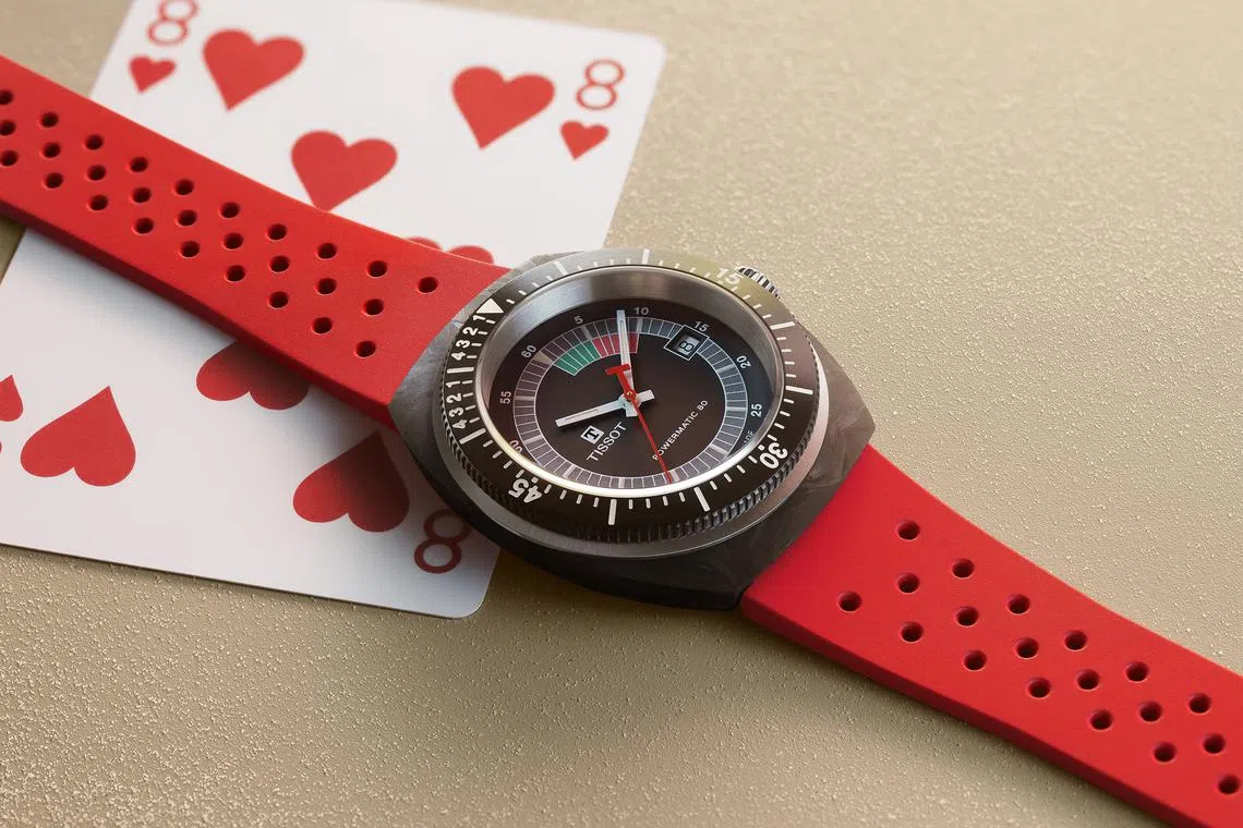 To recapture that trailblazing spirit, Tissot cased the 2023 Sideral in forged carbon, known for its lightweight and resilient properties, just as fibreglass was. In terms of functionality, Tissot reprised the diving bezel of the original, but added a regatta countdown feature on the dial. Driving the watch is the same engine that is housed in the PRX, the Powermatic 80, which can be viewed through the transparent case back.