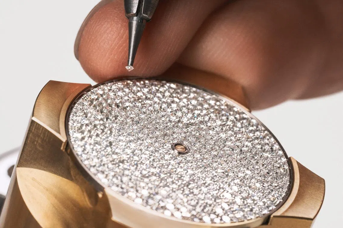 As jewellery enthusiasts know, the technique for snow setting is demanding. The gem-setter needs to select each diamond, all with different diameters, to carpet the dial entirely, with the end goal of obtaining a perfectly even surface and maximum radiance.