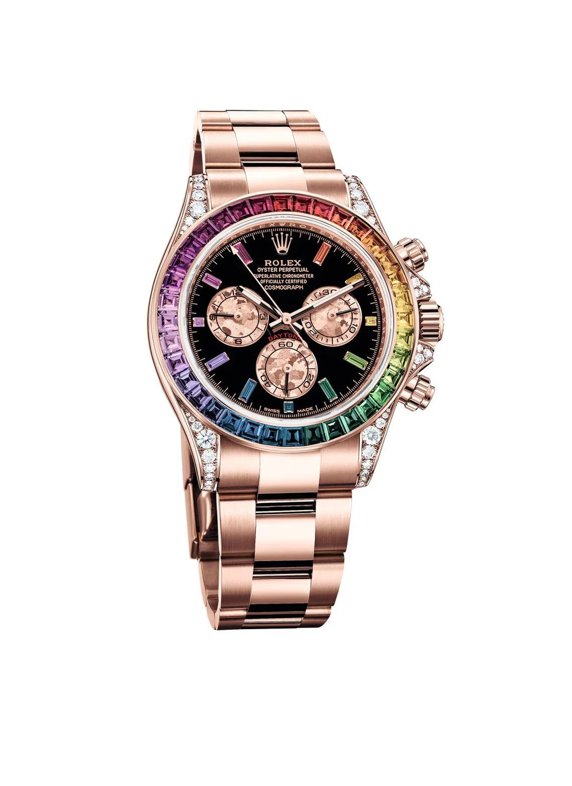 BACK IN 2012, ROLEX SET in motion the trend for rainbow watches when it launched the Oyster Perpetual Cosmograph Daytona fitted with a gem-set bezel in rainbow hues in two versions, 18 ct yellow and white gold. The bezel featured coloured sapphires in gradient shades, earning it the moniker “rainbow”.