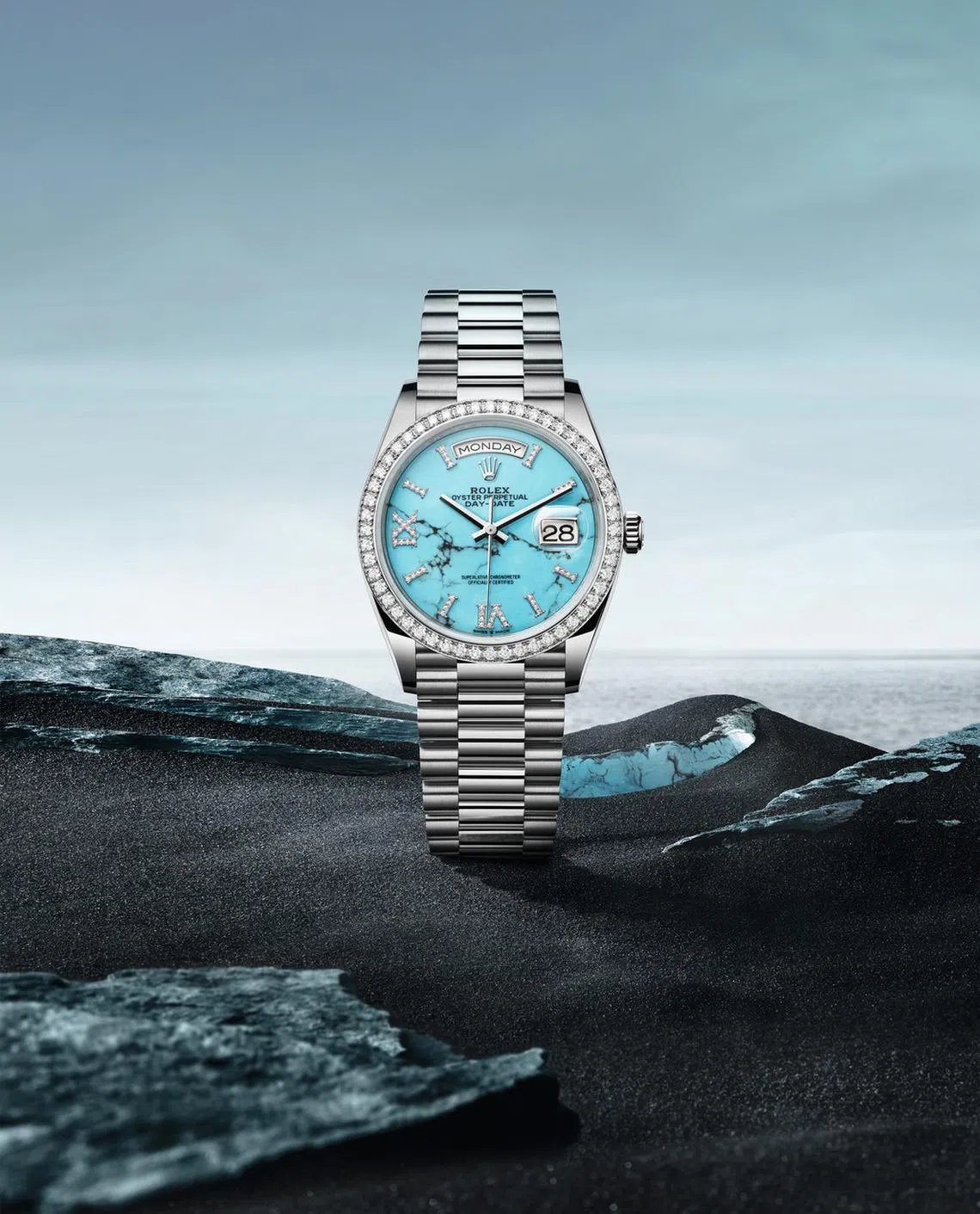 Today, Rolex’s gem-set watches continue to command plenty of attention. Apart from its rainbow watches, its diamond-set timepieces, too, are a marvel: the Oyster Perpetual Lady-Datejust introduced in 2021, for instance, is a shining example of Rolex’s design ethos. The timepiece features 291 diamonds on the dial, and a further 158 brilliant-cut diamonds on the case and lugs, 44 on the bezel, and 596 on the President bracelet.