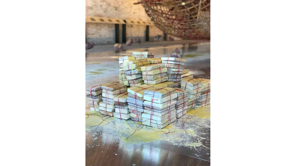 For Venice, Zai has painstakingly created the skeleton of a Phinisi ship, modelled from the vessels he believed Dapunta Hyang sailed in. It has been created onsite using one tonne of rattan, 10 km of red string and 30 kg of beeswax - and not a single nail.