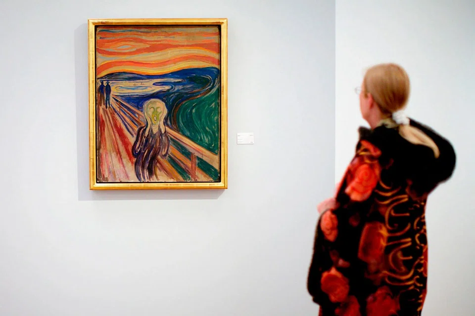 The first version of "The Scream" was released in 1893. It depicts a dark humanlike figure clutching its head in apparent horror against the backdrop of a swirling, red-orange sky.