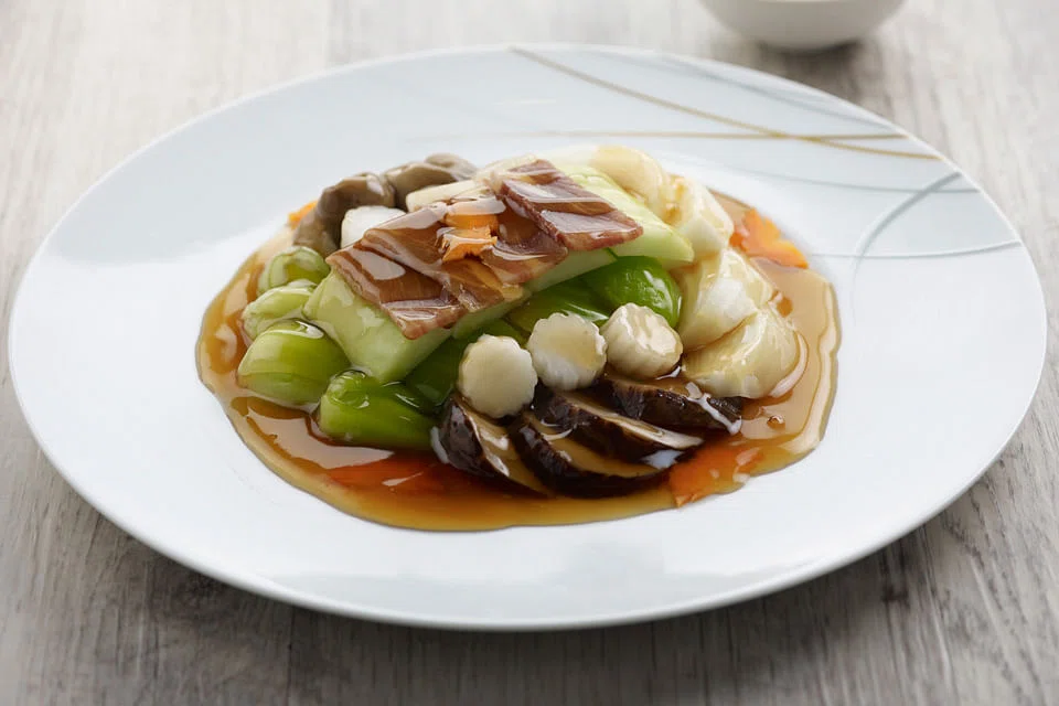 Speaking of health food, we actually like the quadruple seasonal vegetable dish braised with ham, Teochew style (S$18). Melting-soft cabbage, mustard greens and mushrooms could pass for a vegetarian dish if you remove the ham and lie that the surrounding silken gravy isn't made from a stock of pork knuckles, ham and chicken.