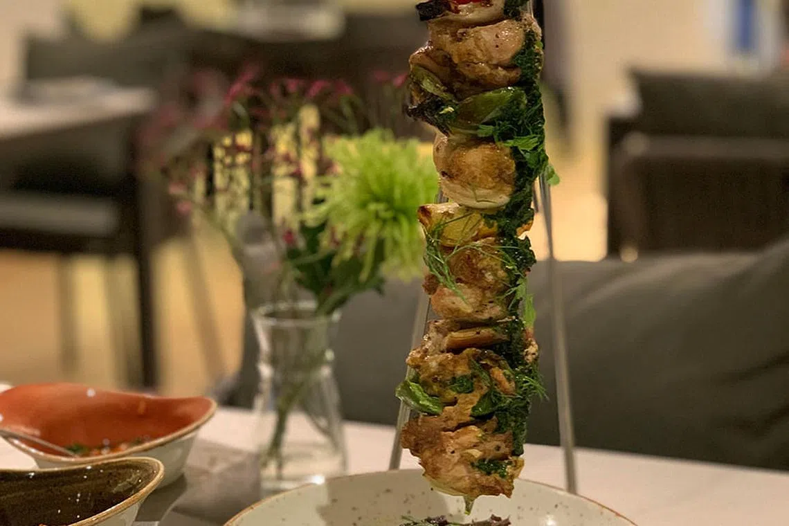 It makes an impressive appearance - a tower of hefty chunks of meat which stay juicy and uncomplaining despite being rolled over hot coals. Mushrooms and peppers are friendly companions on the stick. A trio of dips - garlicky yoghurt, red pepper and aioli - complete this simple but satisfying main.