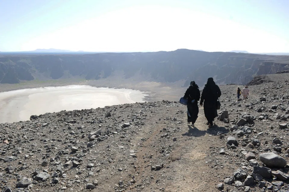 [AL WAHBAH, Saudi Arabia] Gazing at a shimmering salt pan below, a group of first-time Saudi hikers descended craggy slopes into a volcanic crater, part of a hidden trove of natural wonders being promoted to kickstart tourism.