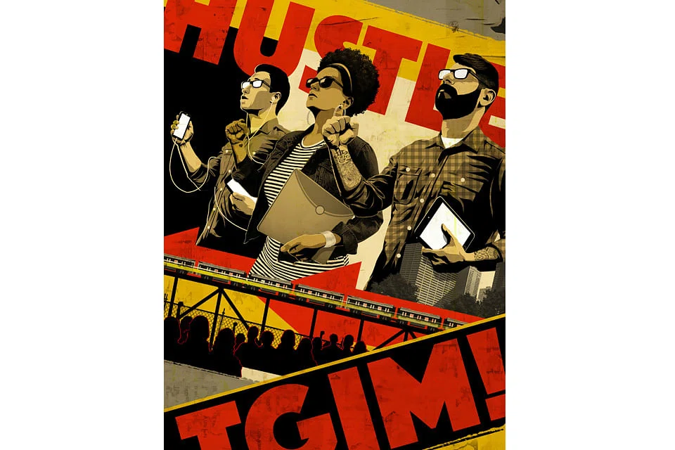 Welcome to hustle culture. It is obsessed with striving, relentlessly positive, devoid of humour and, once you notice it, impossible to escape. "Rise and Grind" is both the theme of a Nike ad campaign and the title of a book by a "Shark Tank" shark.