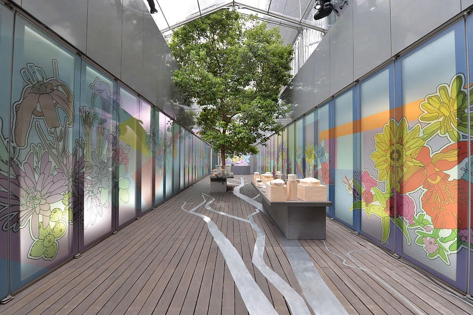 Dubbed Fabulae Naturae, the event hinged upon artworks inspired by 2,200 folders of fabric swatches from the 1920s to the 1980s created by Swiss textile manufacturer Herberlein, which was acquired by Zegna in 2011. The oversized floral prints, in particular, were appropriated into larger-than-life decals that formed murals that sheathed the walls of the brand's headquarters on Via Savona.