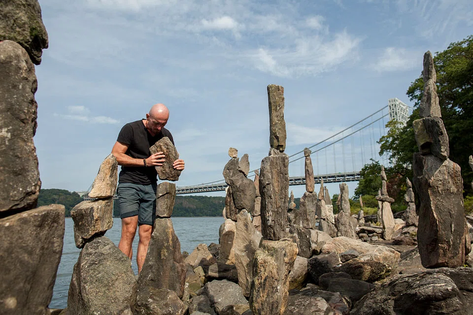 The elegant stacks, skillfully balanced without wires or adhesives, have amazed and bewildered hikers and cyclists since late July, when they began appearing south of the bridge, beside the Hudson River Greenway in Washington Heights. As word has spread, the collection has become a Rorschach test for New Yorkers who make a special trip there and see in it what they will: a skyline, a chessboard, another of the many public art installations that dot the waterfront.