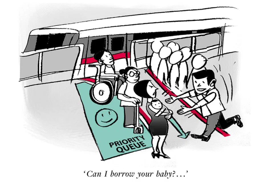 First, the facts. On Thursday, the Land Transport Authority (LTA) announced that it will implement priority queues at all MRT stations, by placing stickers in front of train and lift doors.