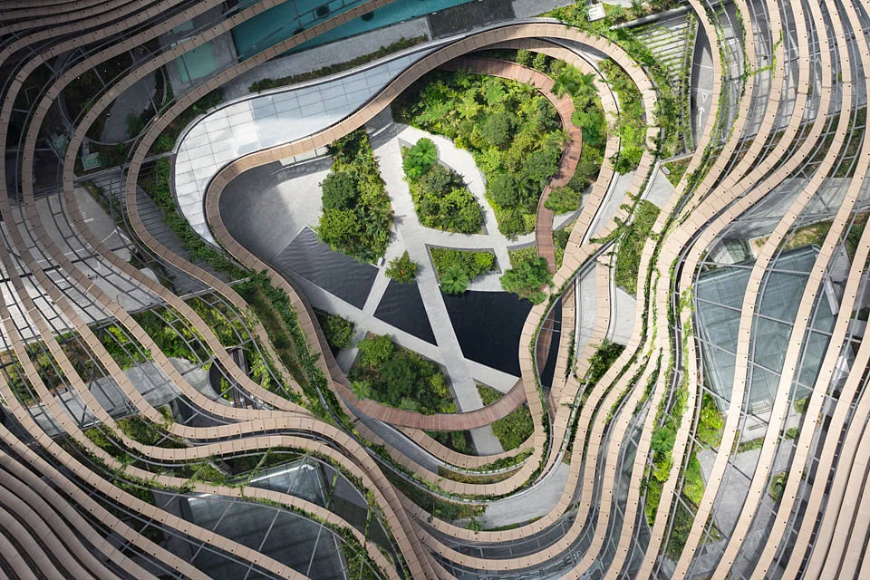To deal with the tropical heat all year round, the development is oriented such that there is no direct west-facing facade. Also, its facade system, comprising glass and bronze-hued metal, contains an outer louvre system with primarily horizontal louvres that provide shading. The organic shape of the building complex with these iconic louvres, together with the Green Heart as its core and the natural vegetation throughout varying levels of the development including the rooftop, facilitates natural ventilation and improves the microclimate. This so-called "green valley" feels up to 20 per cent cooler!