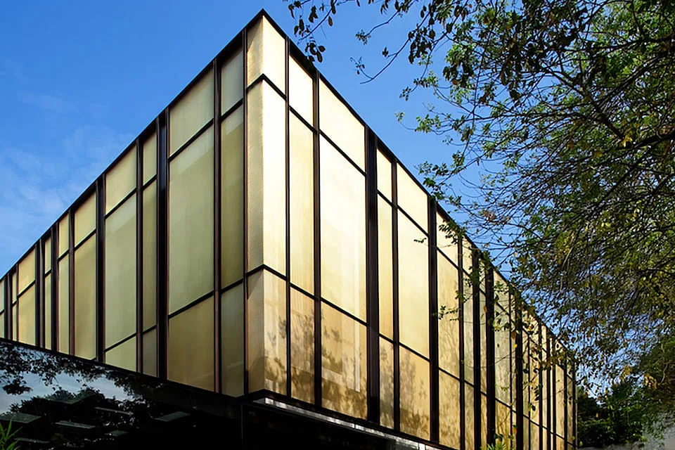 "The facade had to be eye-catching but not too jarring. We effected this through light-gold coloured aluminium mesh facade. At ground level, the front and sides of the house are made of glass just like in a shopping centre - instead of a typical grand wooden door as the house entrance. And as you enter the house, you are greeted by a vast foyer area with a cafe; the kitchen and services areas are tucked behind," he explains.
