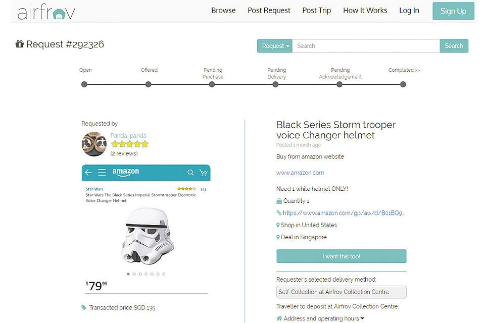 On Airfrov, a sharing platform co-founded by 31-year-old Cai Li, one can even ask a stranger travelling overseas to bring items back to Singapore. The idea came easily to Mr Cai: he always had to shop for his girlfriend when he travelled. These days, requests on Airfrov range from the quirky to the rabid: buying Milo cubes that were only sold in the UK and the United Arab Emirates; snagging a Storm Trooper helmet; catching a Pokemon in the US.