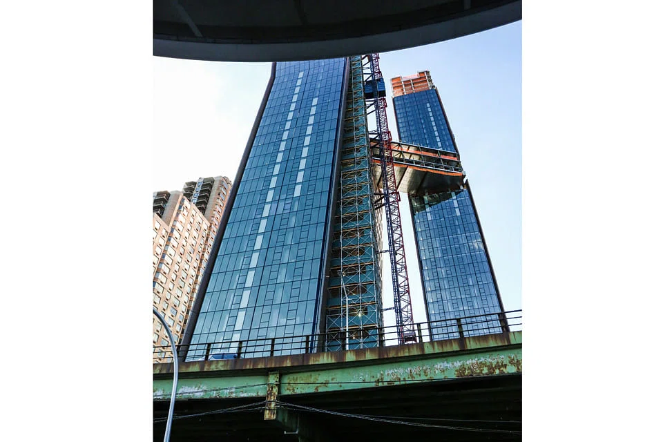 WORKERS have almost completed mounting the copper panelling on the American Copper Buildings (née 626 First Avenue), the new tilting, two-towered development on Manhattan's East Side, but their most striking feature - a three-storey, 100 foot (30 m) long skybridge - is still open to the elements. On Tuesday, a Bloomberg photographer (and a laughably height-averse reporter) had the chance to take the construction elevator up to the buildings' 29th, and then 49th floors, to get a first look.