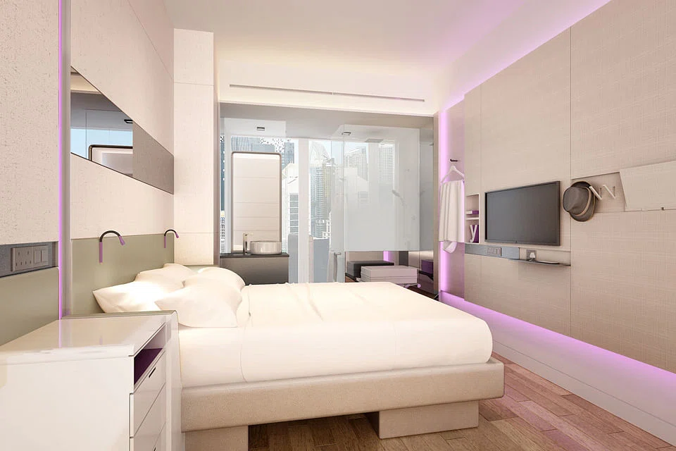The 30-floor YOTEL Singapore has 610 rooms, called "cabins", each equipped with adjustable Smartbed, technowall and smart TV.