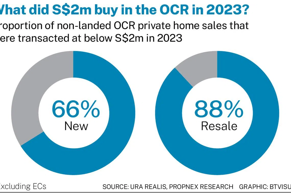 Observations suggest that OCR homes are generally still within the reach of many households, based on the volume of sales at prices up to S$2 million. About 66 per cent of OCR new non-landed private home sales transacted in 2023 were priced below S$2 million. In the OCR resale market, that proportion is higher, at 88 per cent, according to caveat data.
