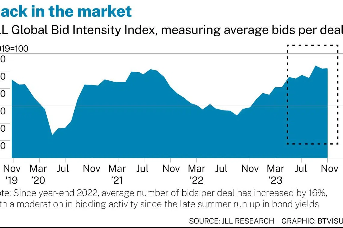According to JLL’s proprietary Bid Intensity Index, a growing number of bidders began re-entering the market last year, accentuated by private credit vehicles from private equity funds, individual investors and select institutional investors like sovereign wealth funds.