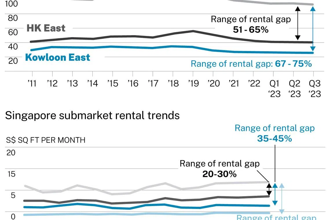 In addition, Hong Kong’s decentralised areas offer rents that are a fraction of Central’s, boasting discounts of up to 75 per cent. Comparatively, the rental gap between Singapore’s CBD and decentralised offices is narrower at 20 to 45 per cent.