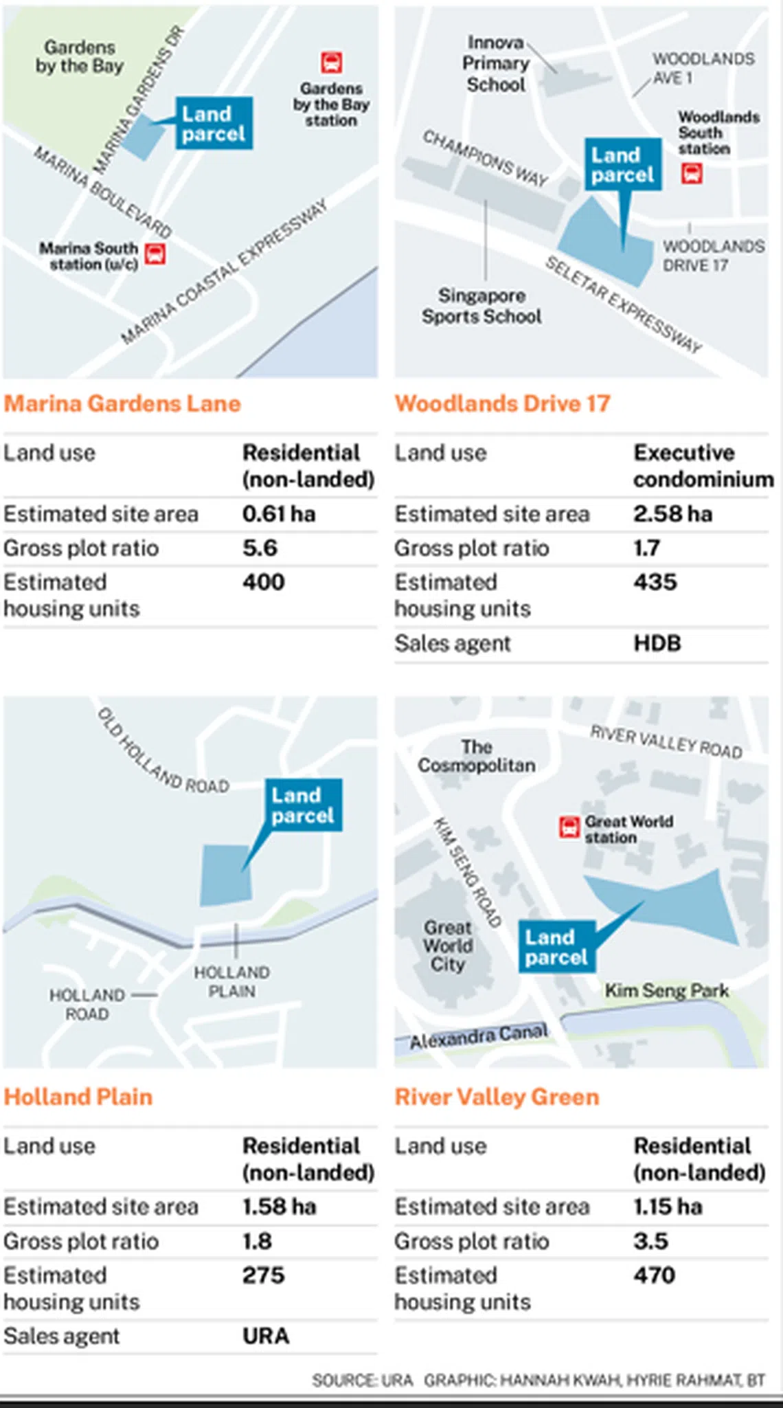 The four new sites on the reserve list include two prime parcels of land in Marina Gardens Lane, River Valley Green (Parcel C), as well as an executive condominium site in Woodlands Drive 17. A site in Holland Plain, next to the Holland Link site, may also be triggered for sale if a developer makes a suitably high offer.