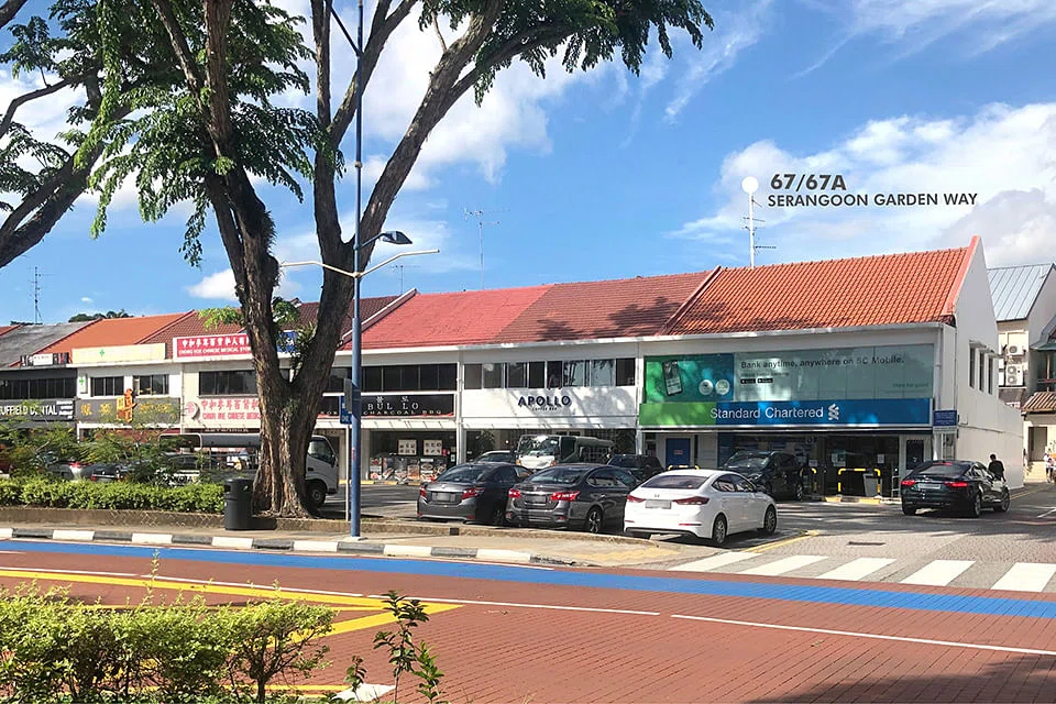 Located at 67/67A Serangoon Garden Way, the property sits on a 999-year site of approximately 2,782 square feet; the built-up area is 4,165 square feet.