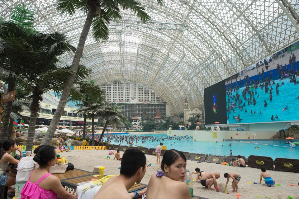 Home to hundreds of shops, restaurants, offices, a cinema and ice rink, the cavernous building in Chengdu, deep in southwestern China, also hosts a water park featuring a pool modelled on the seaside.