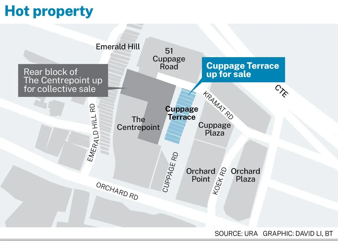 The move comes on the heels of a collective sale offer at neighbouring Orchard Road mall The Centrepoint. Valued at S$250 million, Cuppage Terrace houses food and beverage outlets sitting on a land area of 28,986 square feet (sq ft), directly facing the rear block of The Centrepoint which was put up for sale about two weeks ago at S$418 million.