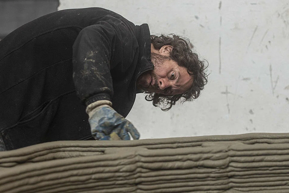 When the robot is done, the concrete bedroom and bathroom modules will be attached to a wooden core with large windows and completed with a wooden roof.