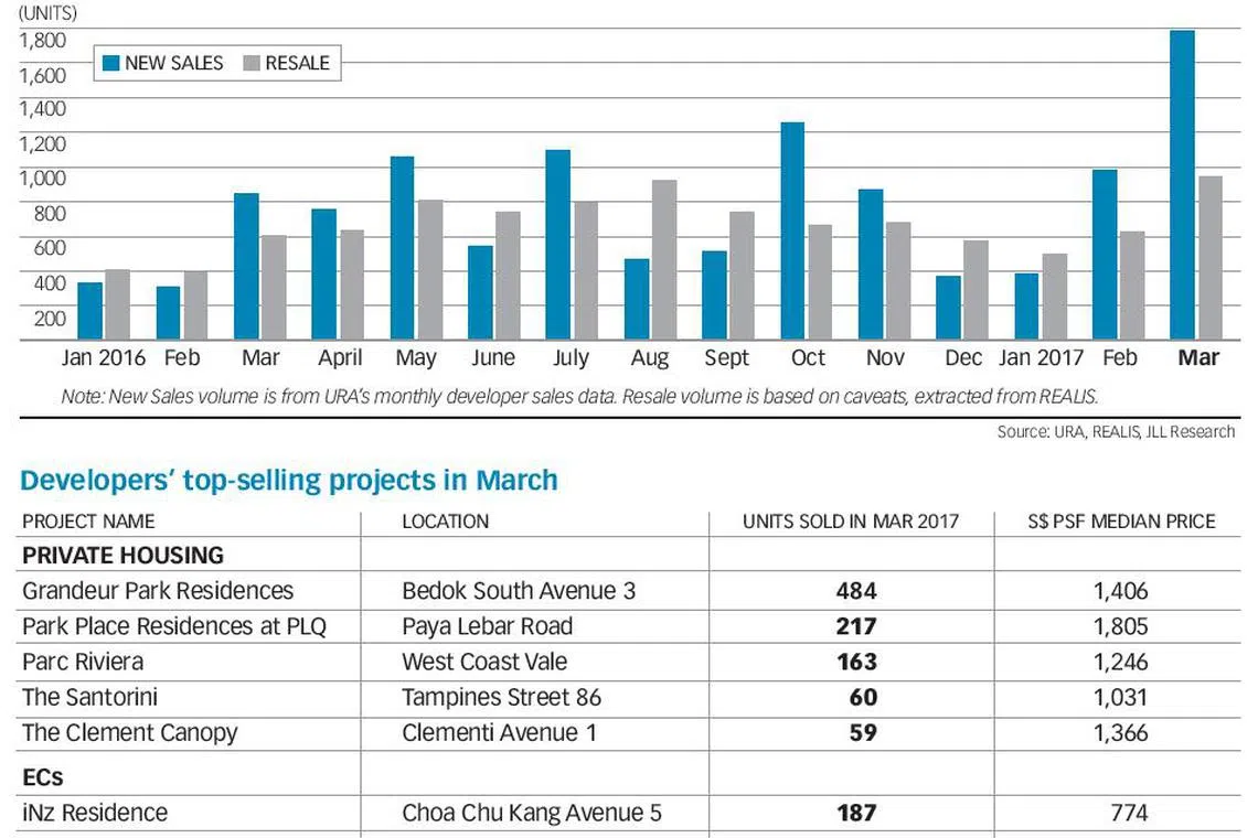 Developers also sold 578 executive condominium (EC) units last month, higher than the 329 units moved in February, and the 485 moved in March last year. The preliminary Q1 2017 new EC sales by developers is 1,091 units, surpassing the 734 units in the previous quarter and the 762 units in Q1 2016.