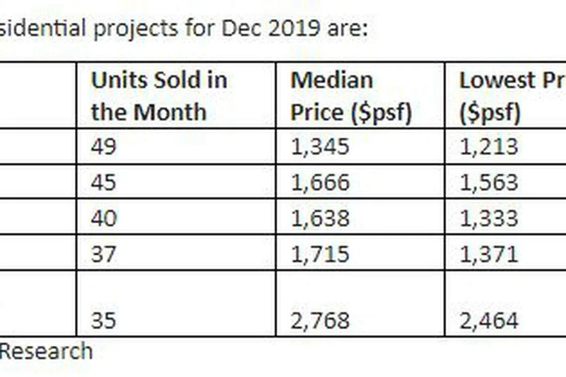 Some of the top selling projects in December were Parc Botannia, with 49 units sold at a median price of S$1,345 per square foot (psf), Parc Esta with 45 units sold at a median price S$1,666 psf and Parc Clematis with 40 units sold at a median price S$1,638 psf.