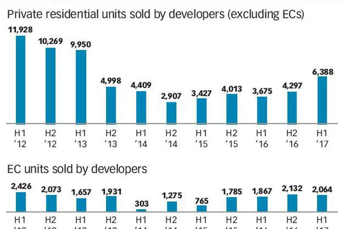 The H1 tally of 2,064 is slightly over half the 3,999 for full-year 2016. PropNex Realty chief executive Ismail Gafoor predicts this year could end with about 3,500 sold in the primary market. ERA Realty Network key executive officer Eugene Lim predicts 3,000-4,000.