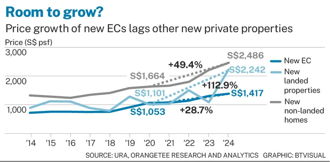 One possible reason why EC price growth lags other segments could be the borrowing limits and income ceiling rules imposed. They are put in place to ensure that the properties stay accessible to more people who do not end up overstretching their budgets.