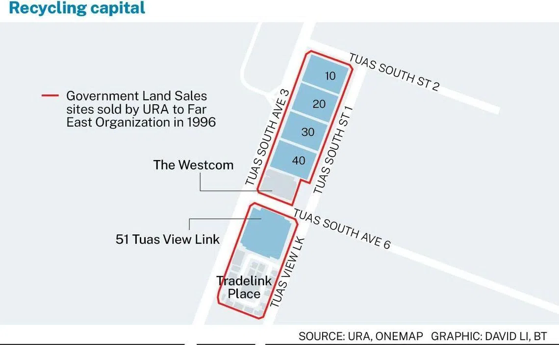 Similarly, the 51 Tuas View Link plot was part of a larger site of about 969,700 sq ft which Far East bagged at a URA tender that also closed in February 1996. The group developed the remaining land into the Tradelink Place project, which is fully sold.