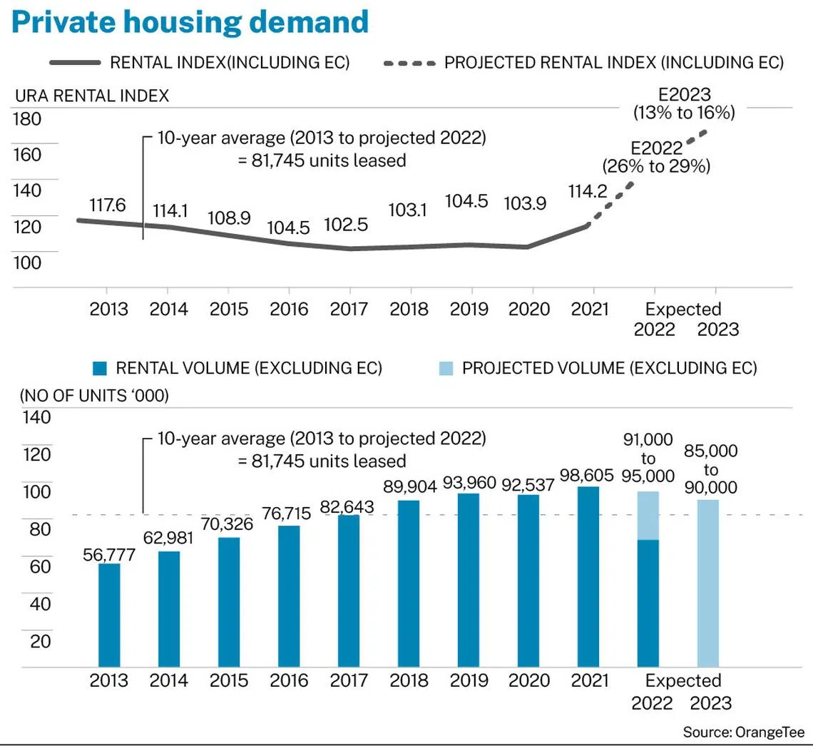 It projects rents to rise further in 2023, although at a slower rate for both HDB and private rentals. Volumes, meanwhile, may moderate slightly as rental supply continues to shrink in the long term.